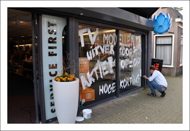 Om het publiek op deze aktie te wijzen nam onze werkgever eigenhandig de kalkkwast ter hand